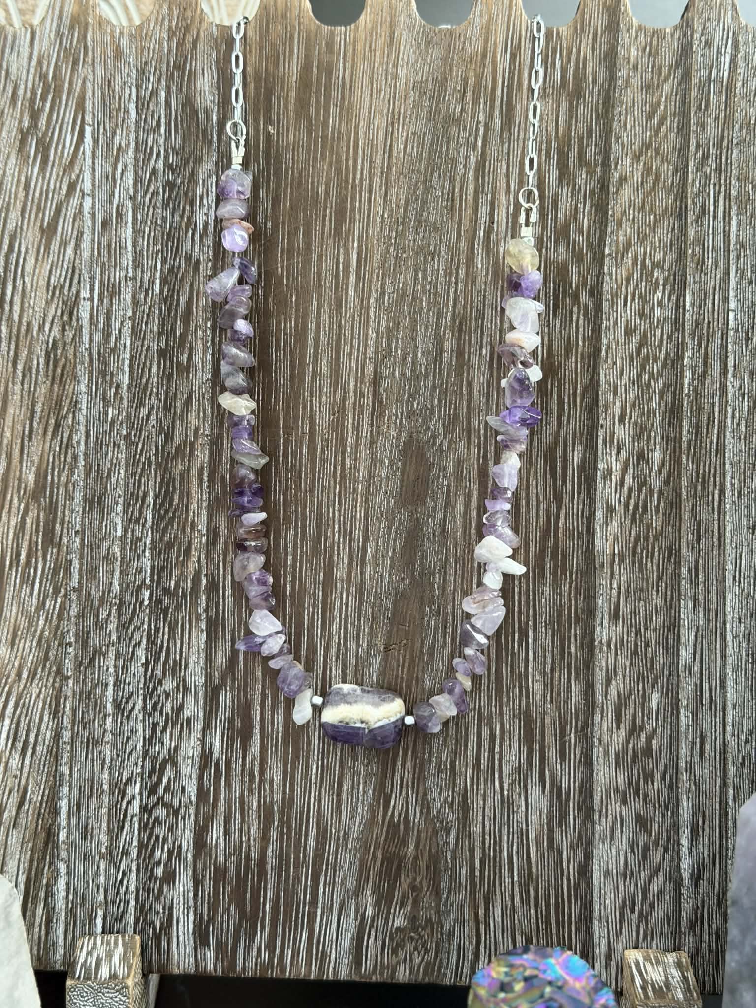 22" stainless steel paperclip chain & Amethyst chip necklace. Statement Amethyst square bead.