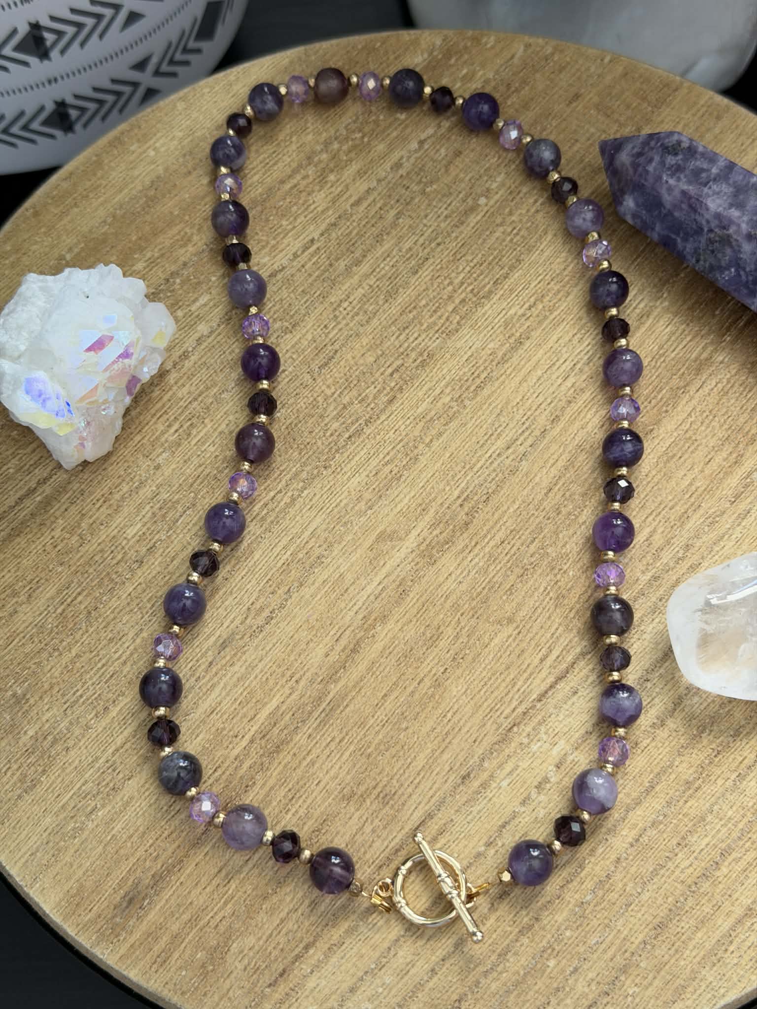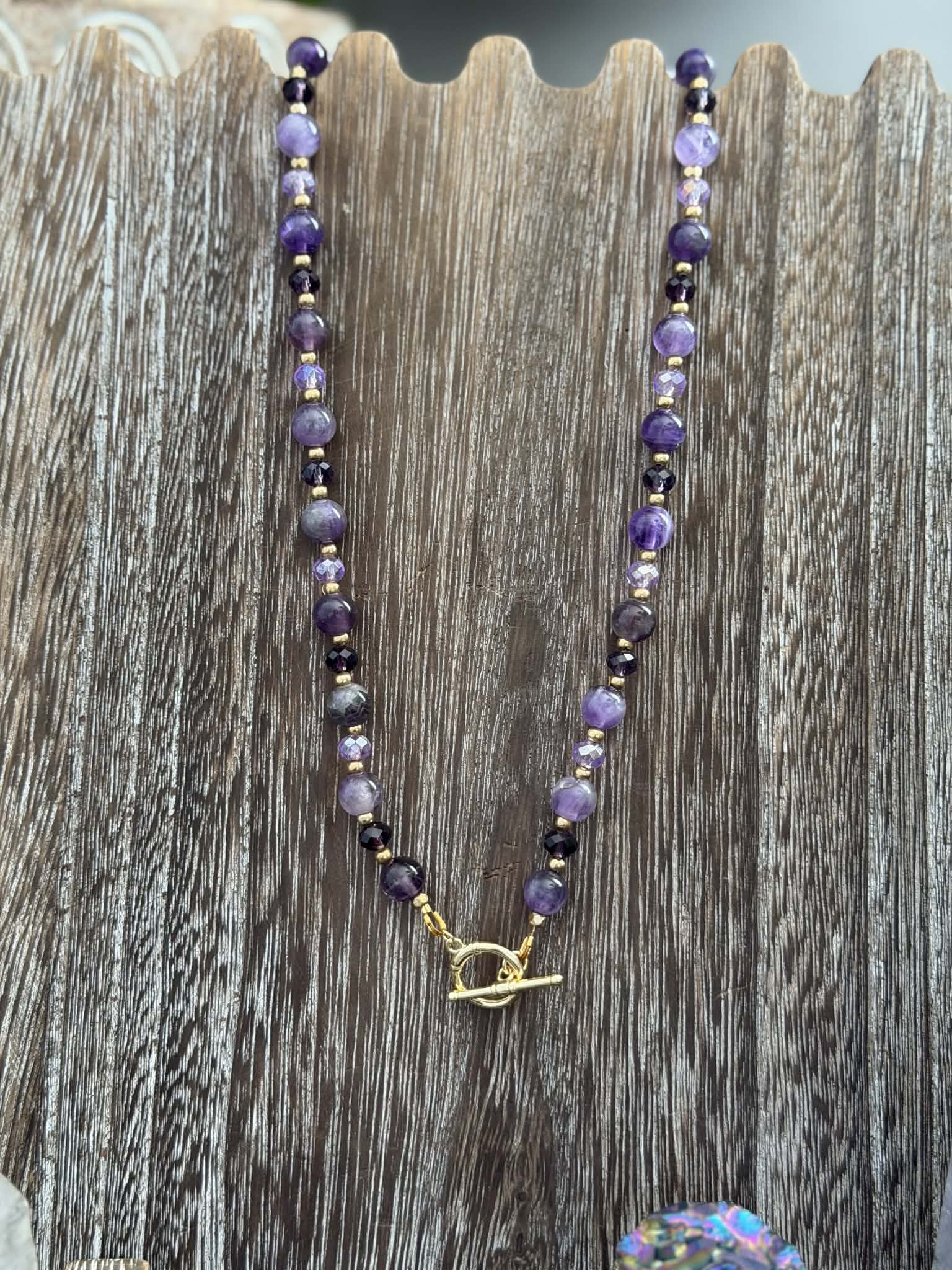 20" Amethyst toggle clasp necklace with different coloured purple glass beads.