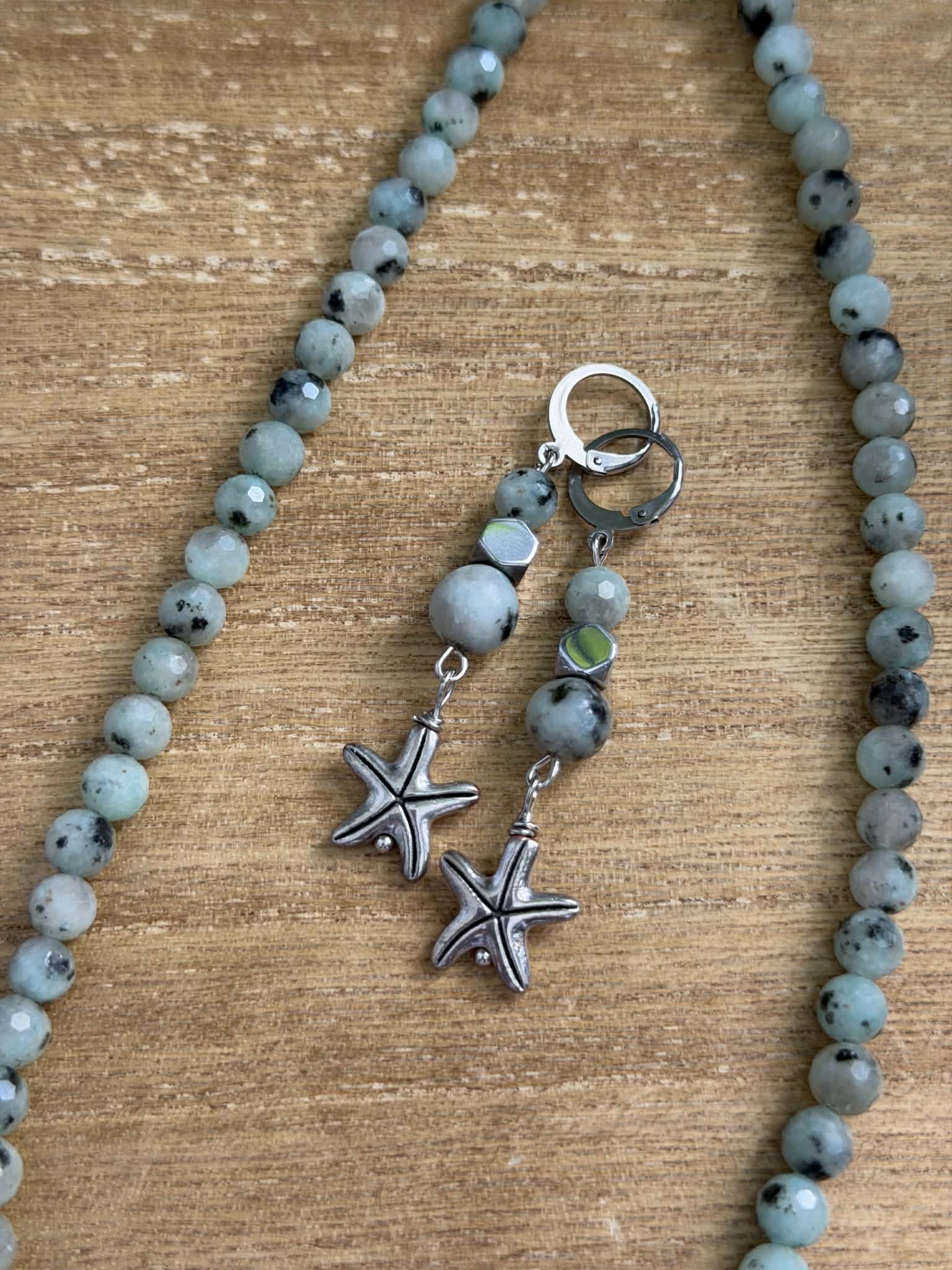 Wire wrapped starfish charms (regeneration, resilience, renewal) with Kiwi Jasper & Hematite beads. Stainless steel leverback clasps.