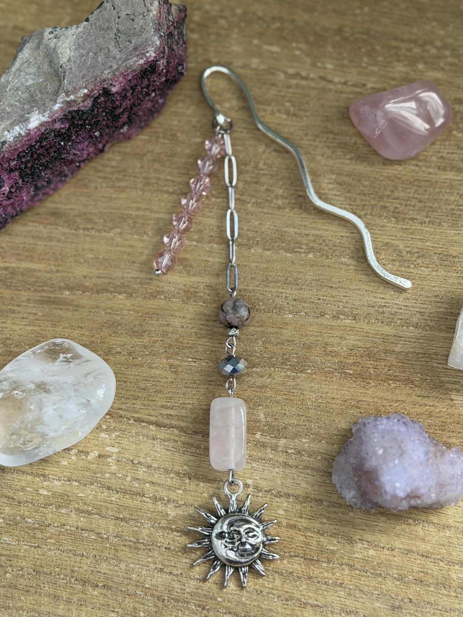 Rose Quartz & Rhodonite beaded bookmark created with stainless steel paperclip chain & a celestial charm. Since both of these stones are associated with love, this bookmark would be perfect for romance readers.