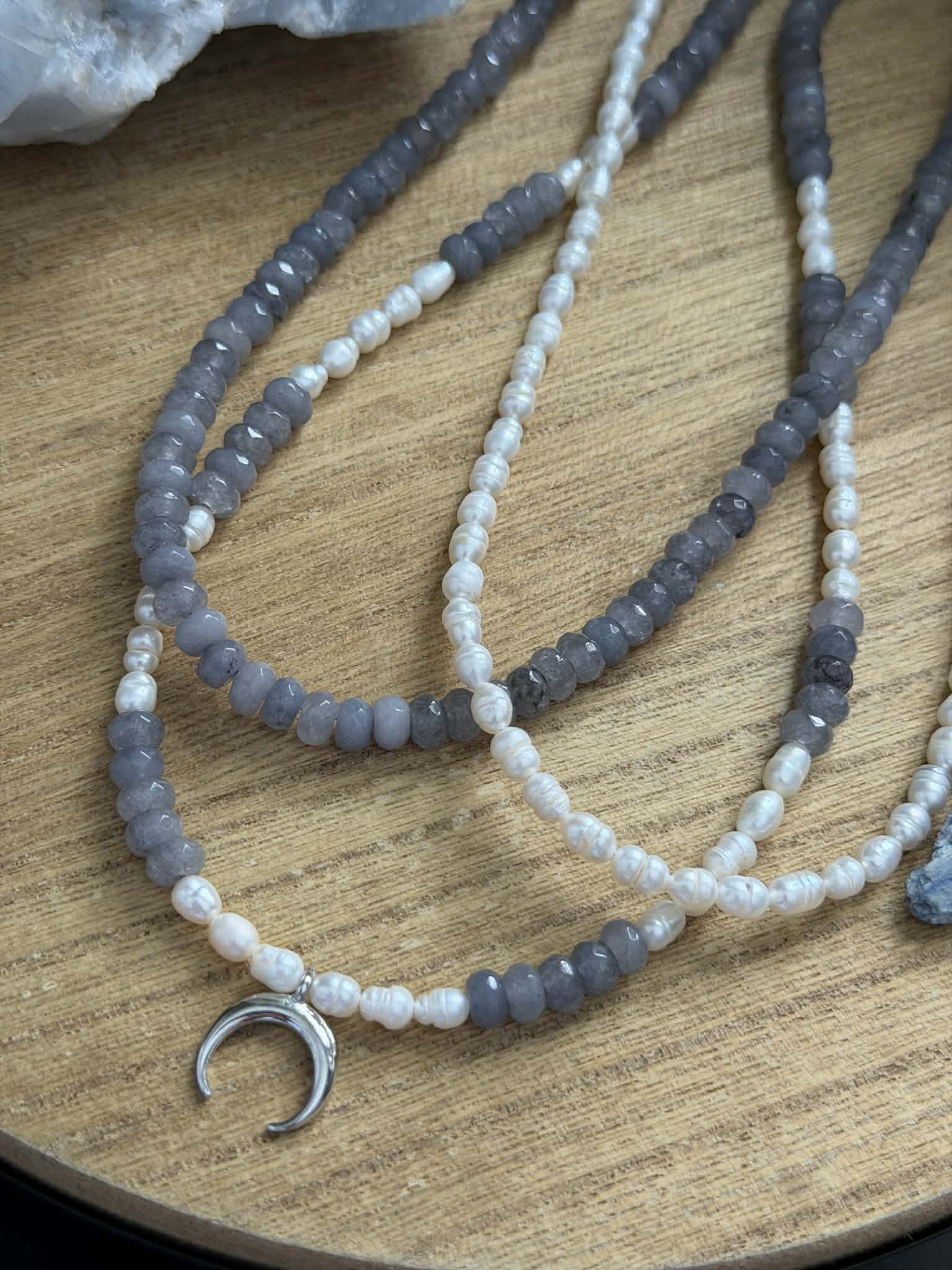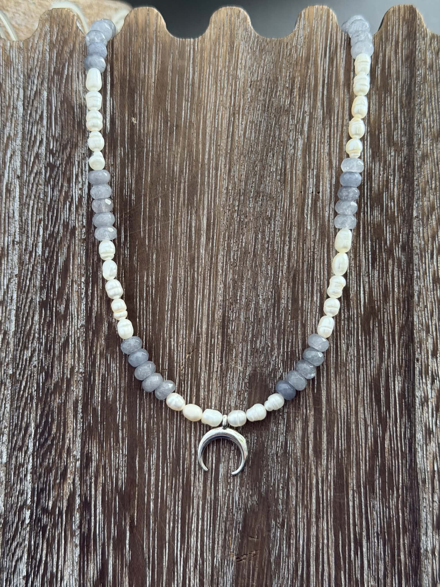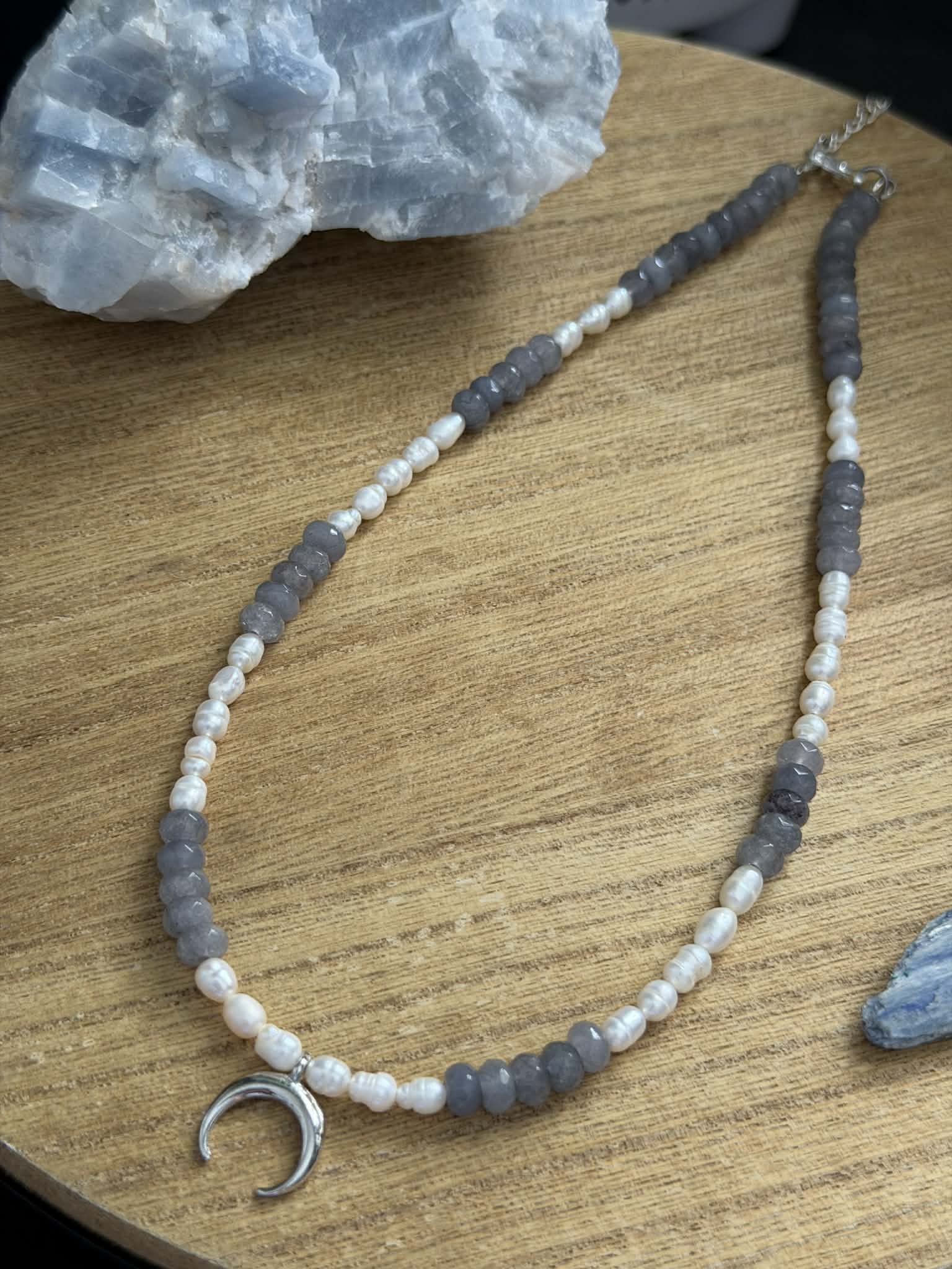 Dainty adjustable freshwater pearl and light blue grey aventurine crescent moon necklace. Simple and elegant piece for your necklace collection.