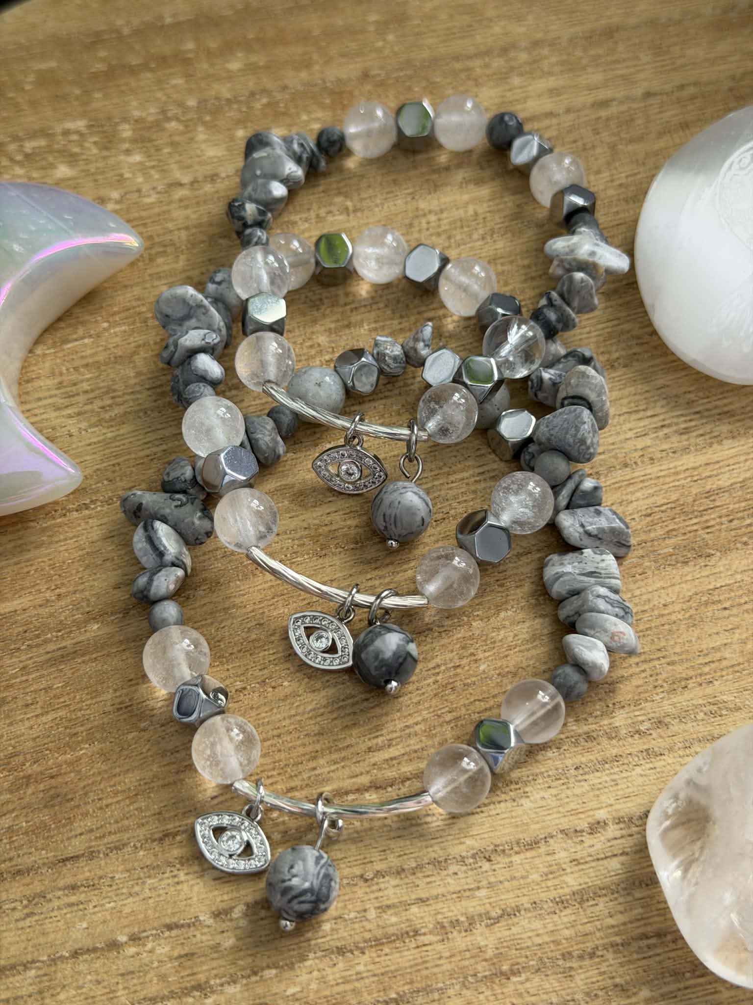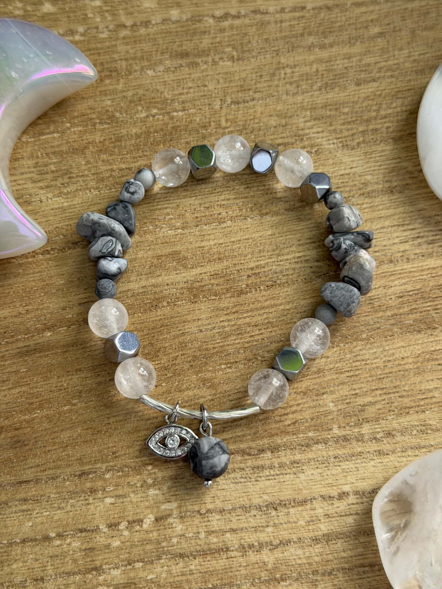 Clear Quartz, Hematite & Picasso Jasper beaded bracelet with a malocchio protection charm. 7 inch wrist size.