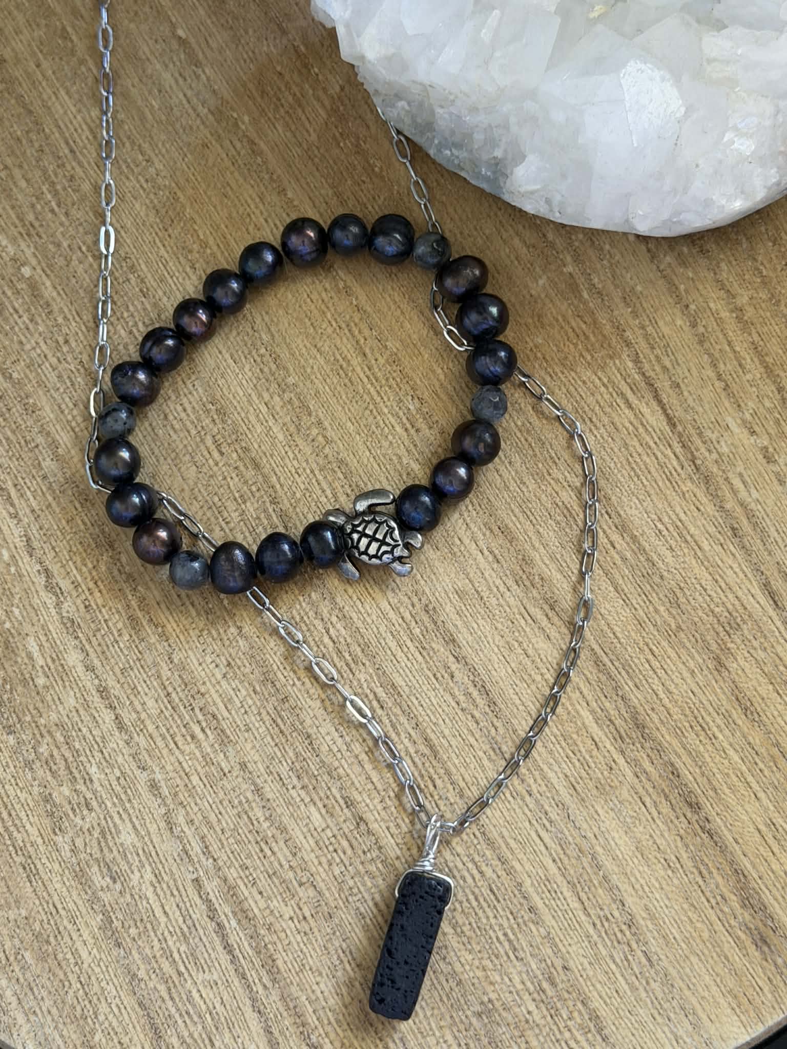 7" Dark coloured Freshwater Pearls & Larvikite beaded bracelet with a turtle charm.