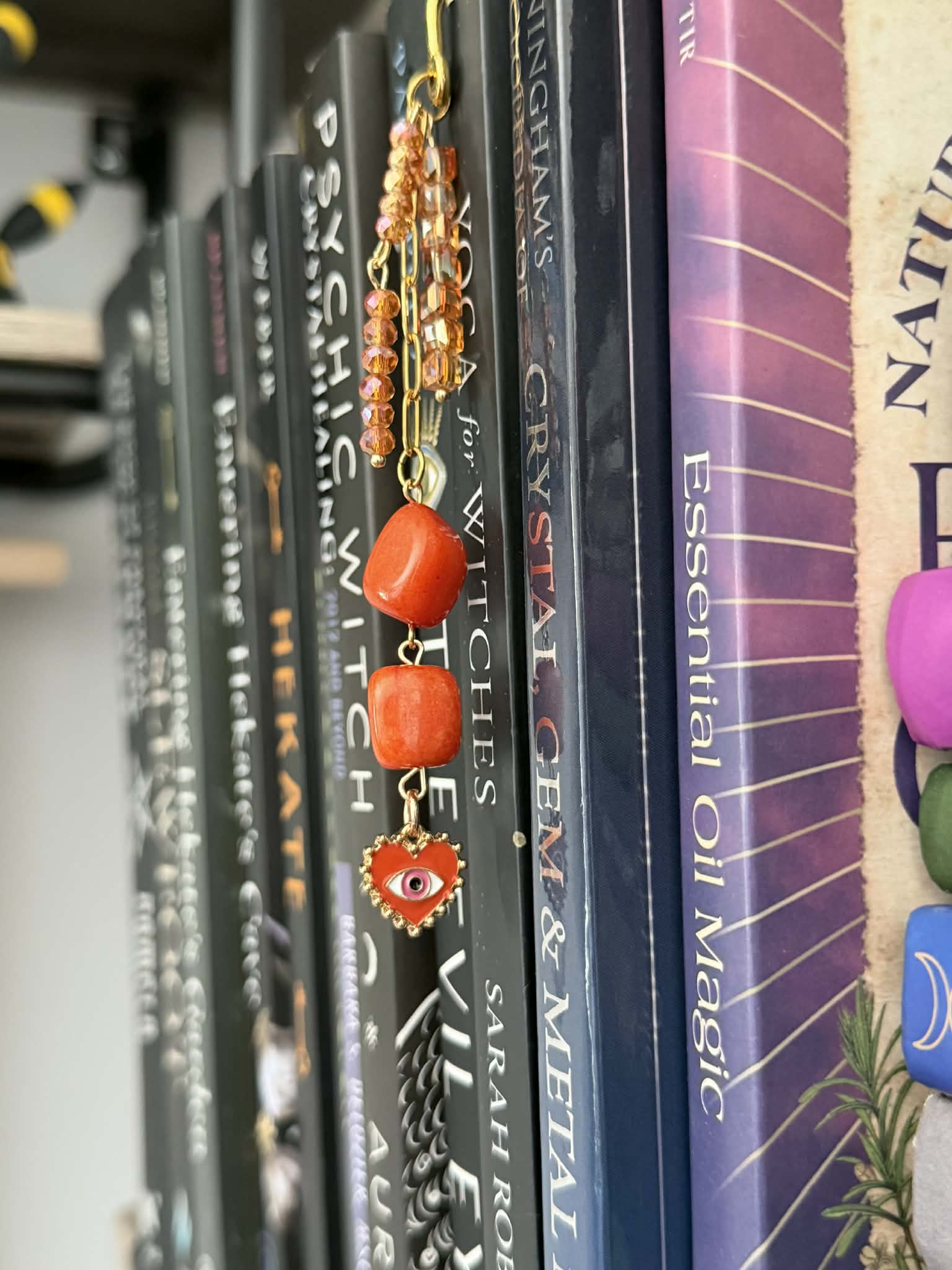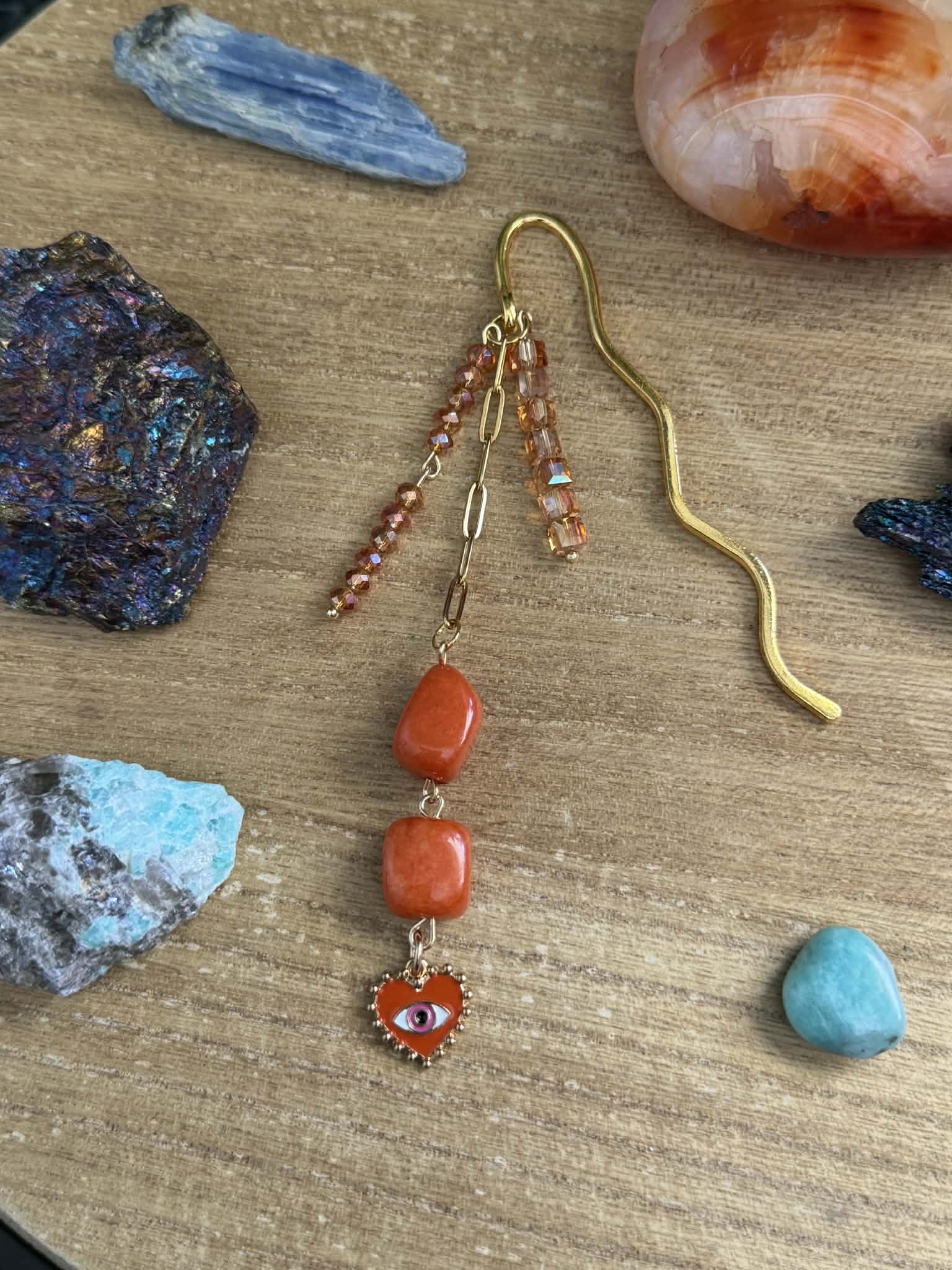Orange Aventurine beaded bookmark with gold plated stainless steel paperclip chain & orange malocchio protection heart charm.
