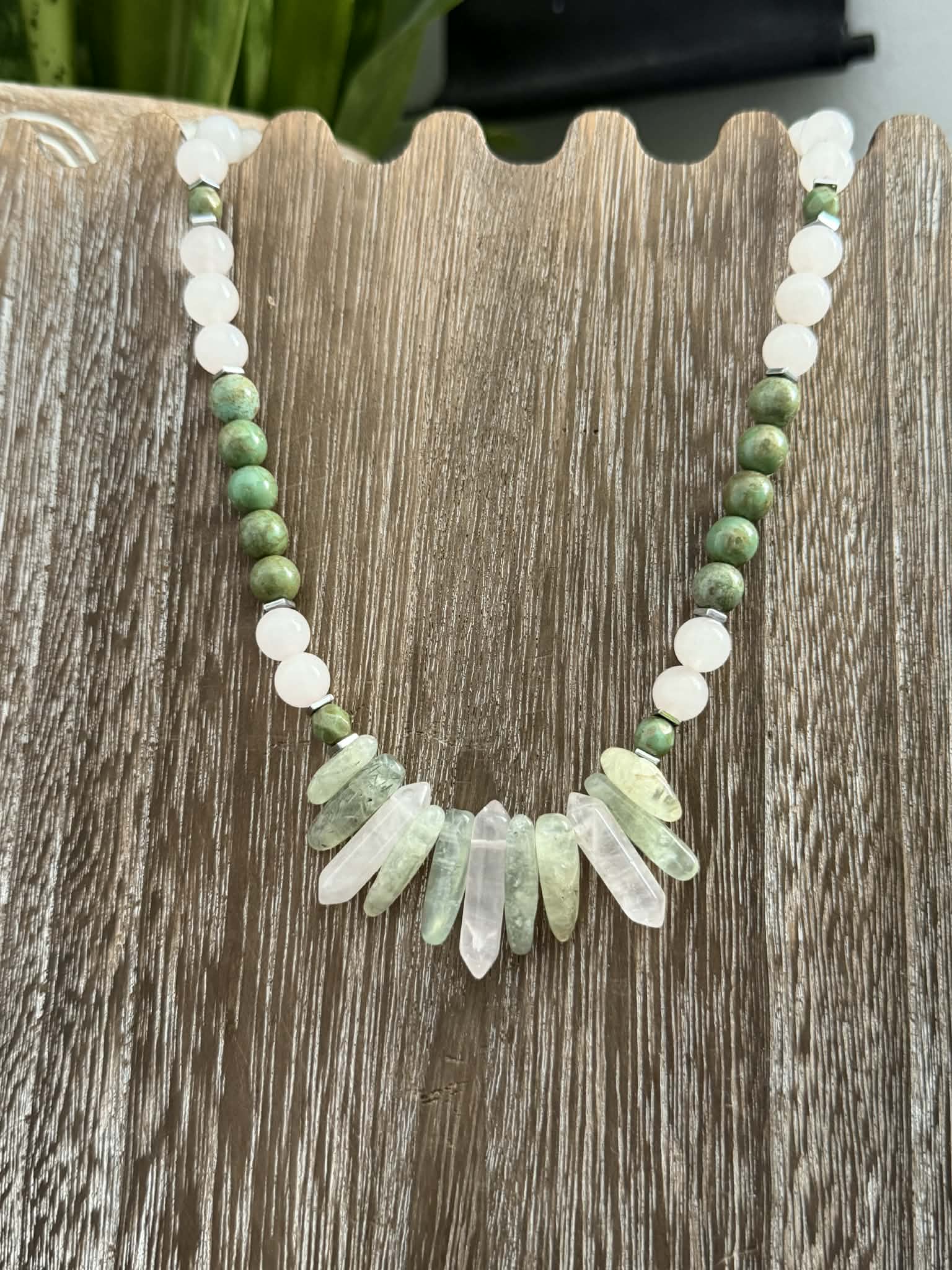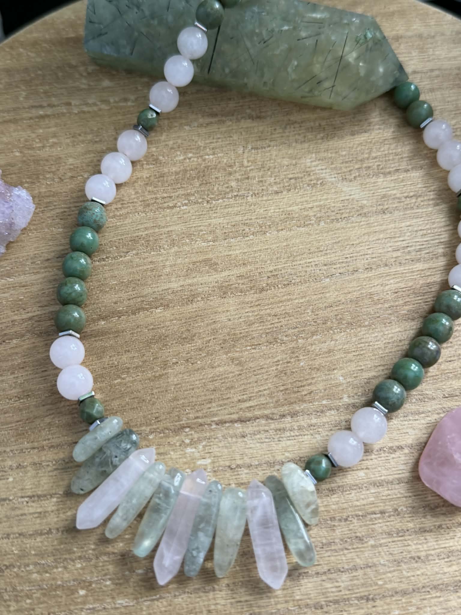 20" Prehnite, Rose Quartz, Green Jasper gemstone necklace.