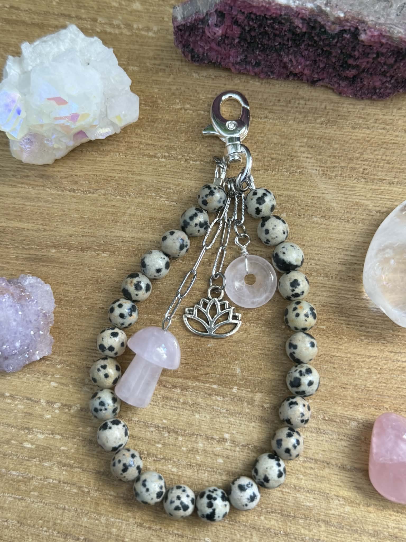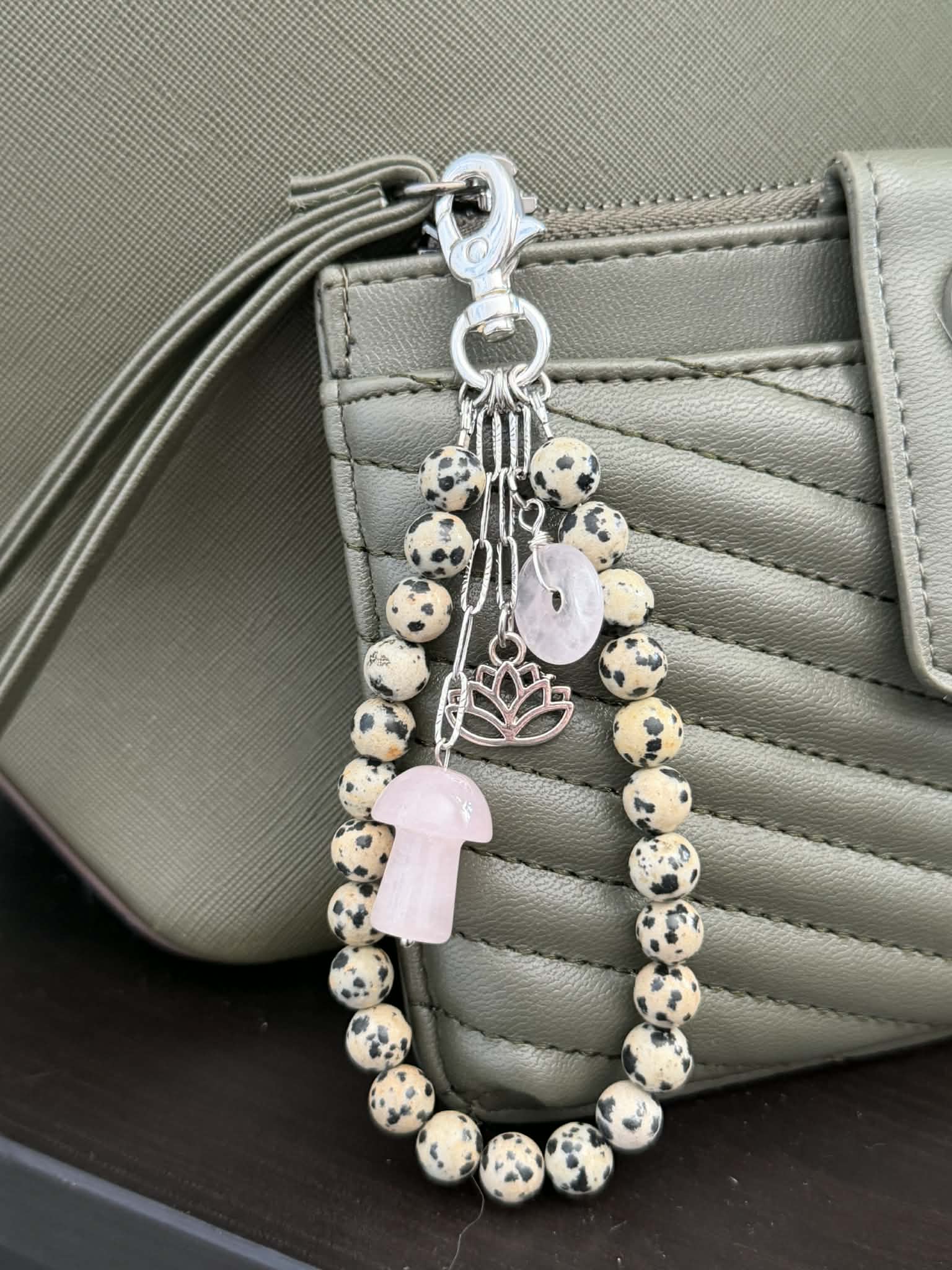 Dalmatian Jasper & Rose Quartz beaded handbag charm.
