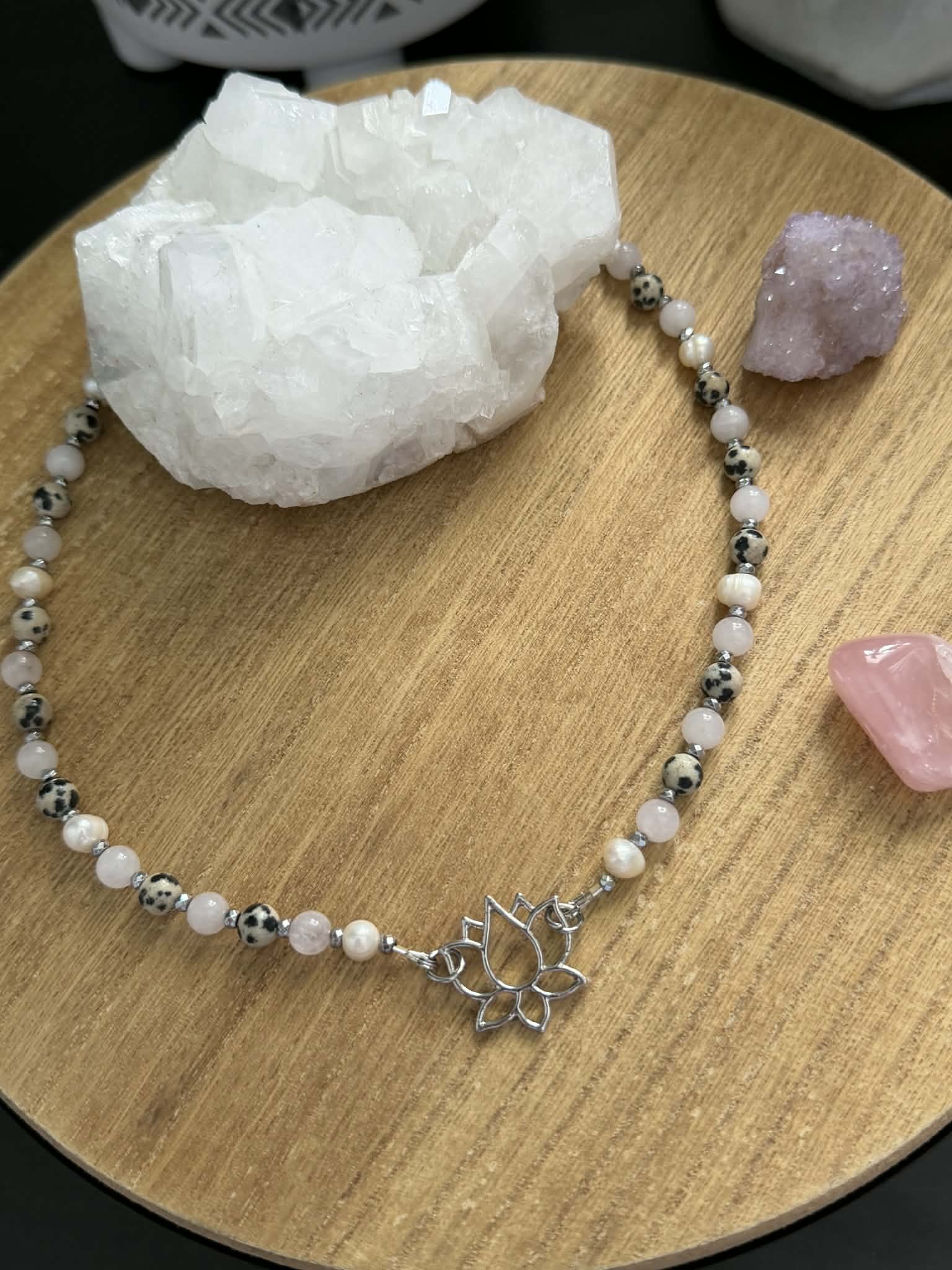 20" adjustable necklace combining Rose Quartz, Freshwater Pearl, & Dalmatian Jasper stones. Lotus flowers are a symbol of growth, resilience, and transformation. They rise from muddy waters and bloom into beautiful flowers.