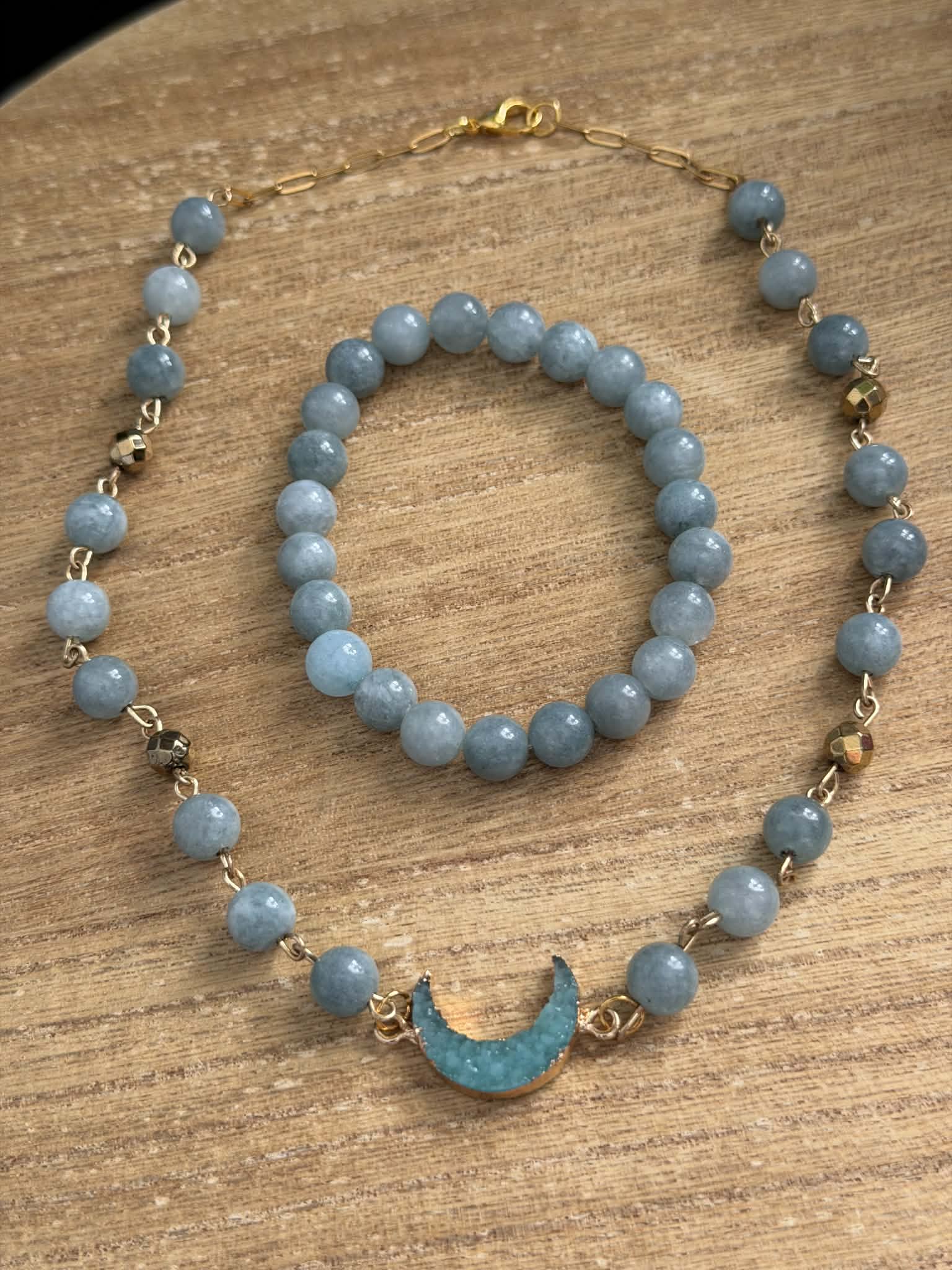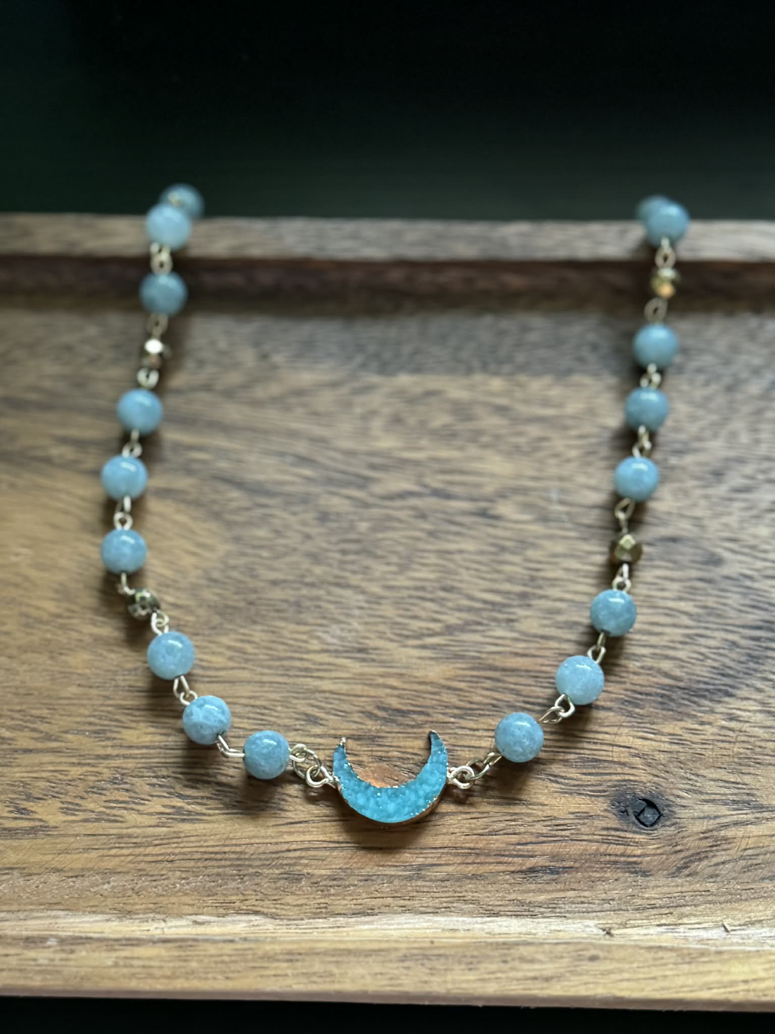 Burmese Jade beads featured with an electroplated druzy crescent moon pendant