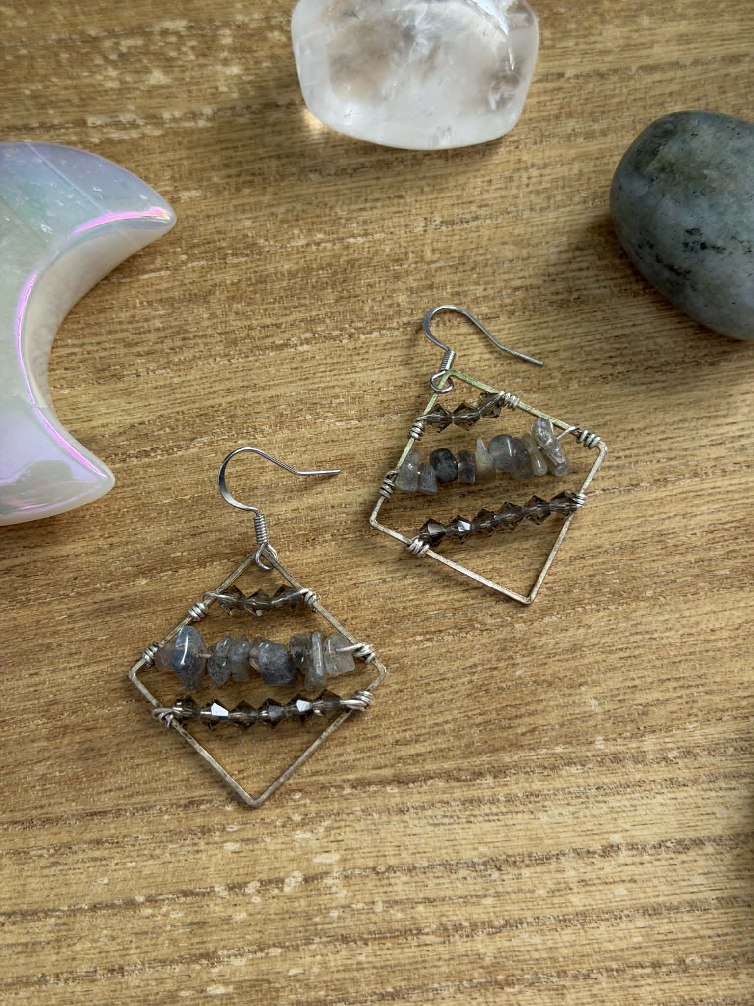 Wire wrapped Labradorite crystal chips & glass beads created with stainless steel earring hooks.