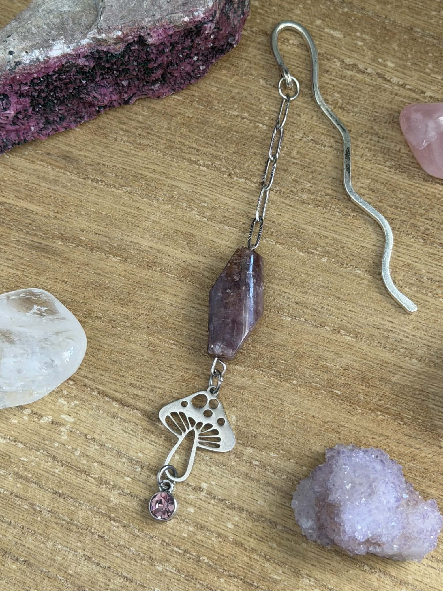Lepidolite beaded bookmark created with stainless steel paperclip chain and mushroom charm.