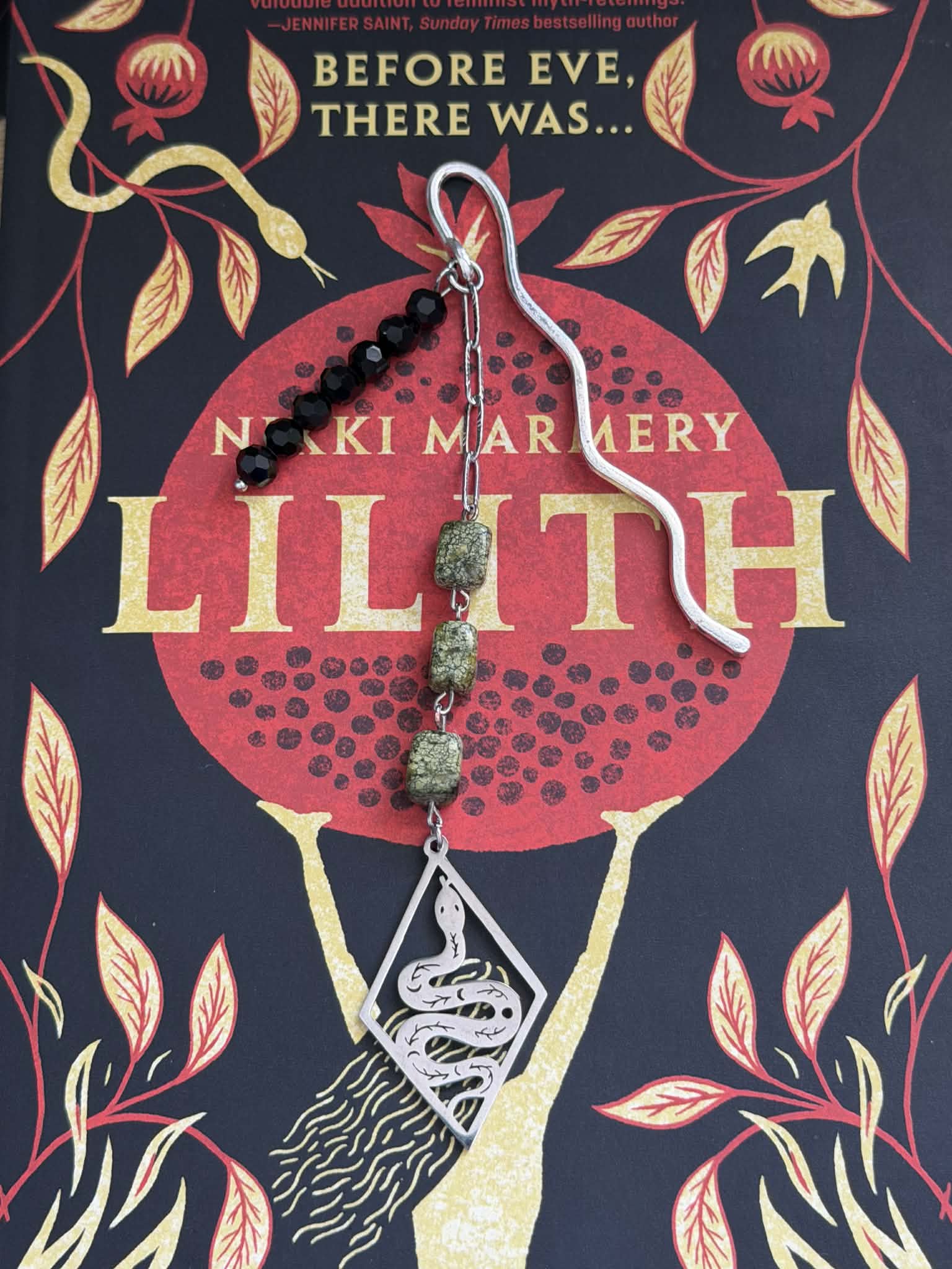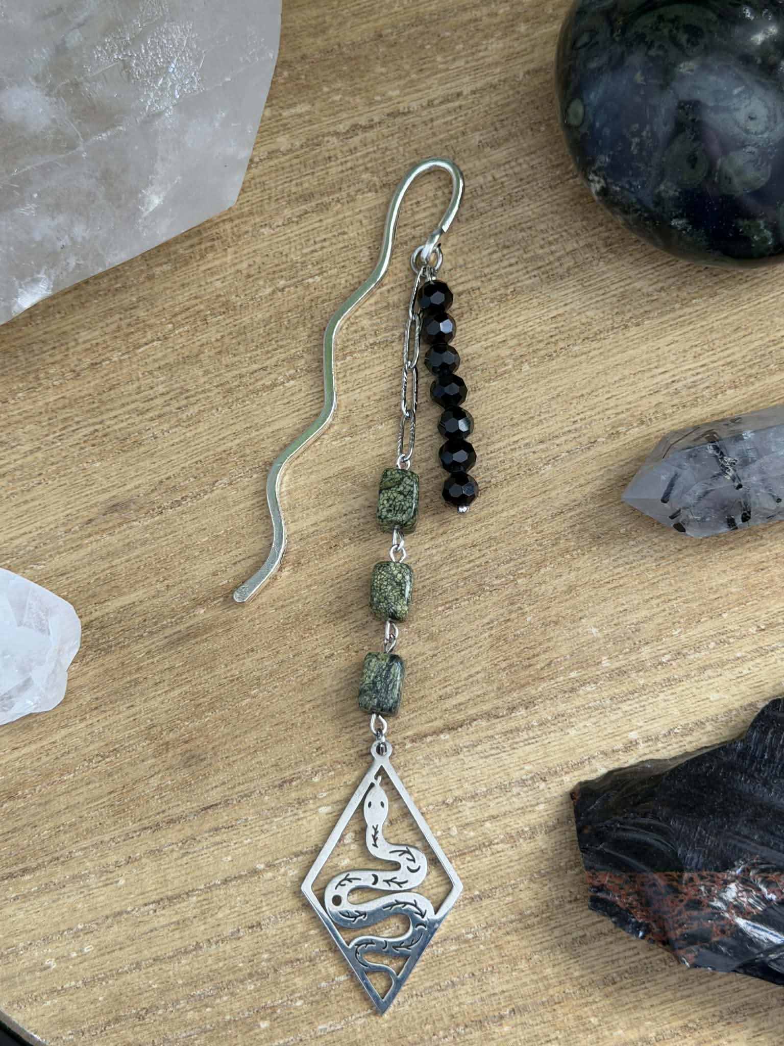 Snakeskin Jasper & black glass beaded bookmark created with stainless steel paperclip chain & snake goddess charm.