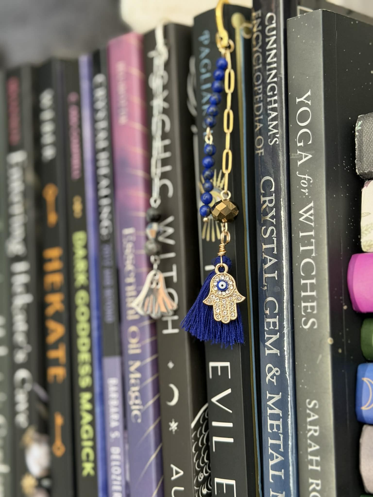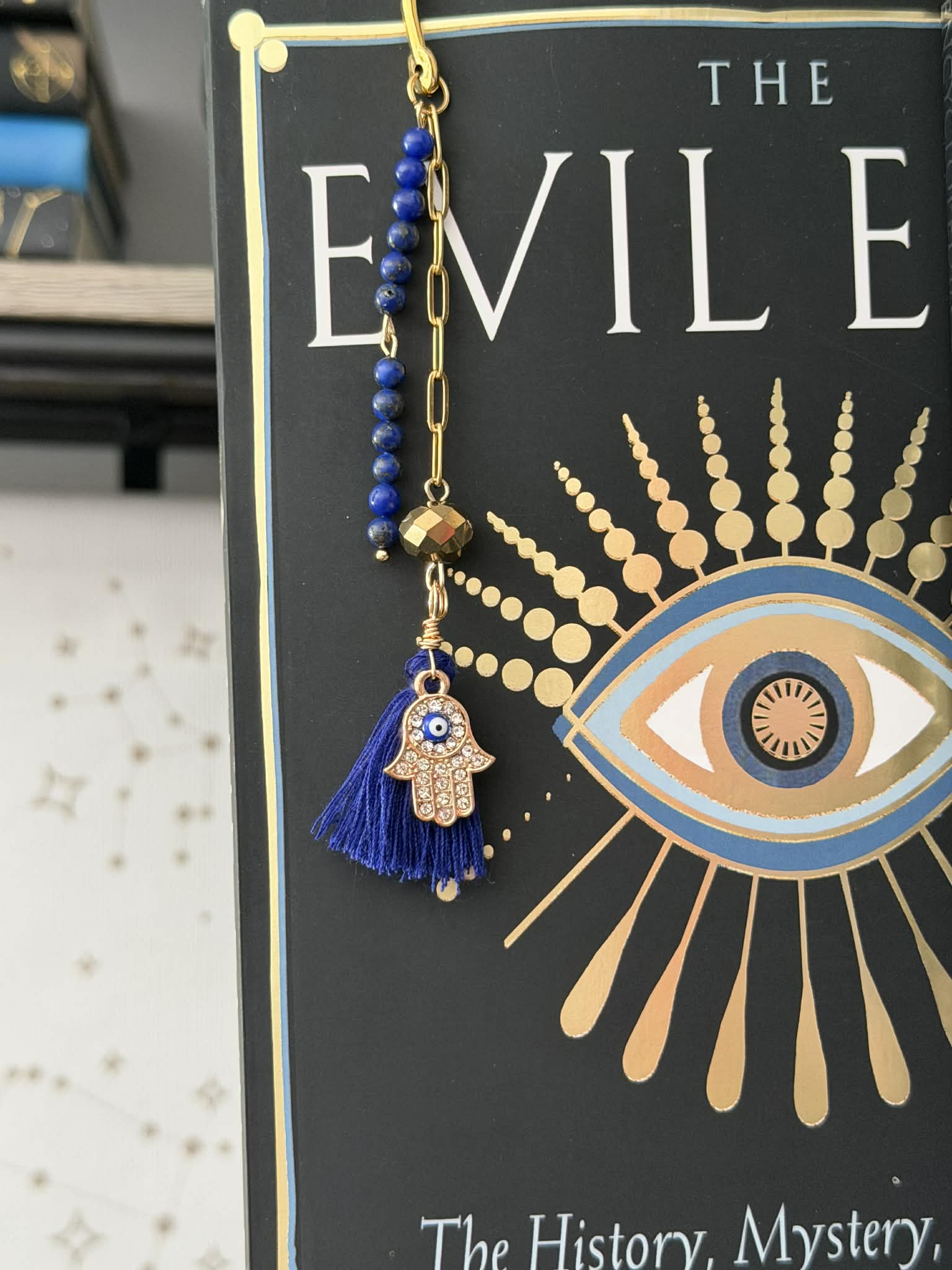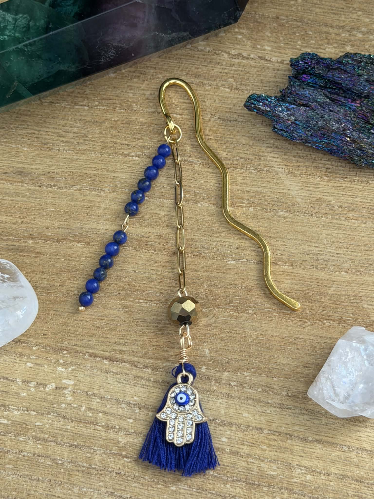 Lapis Lazuli beaded bookmark with gold plated stainless steel paperclip chain and a hamsa hand protection charm.