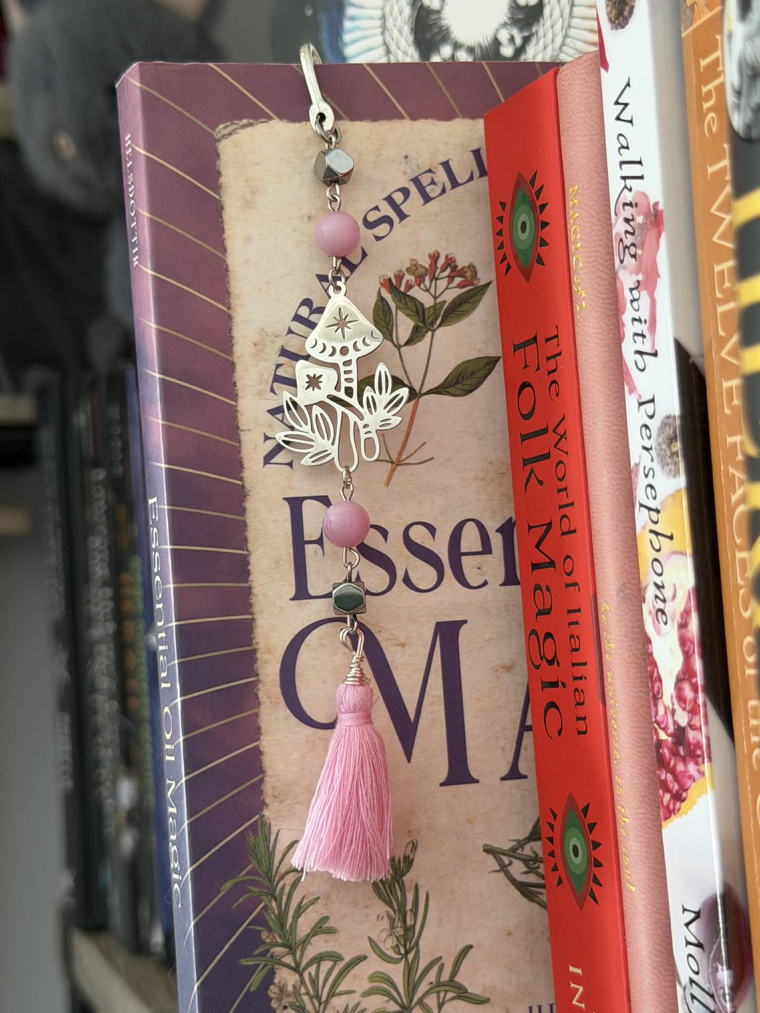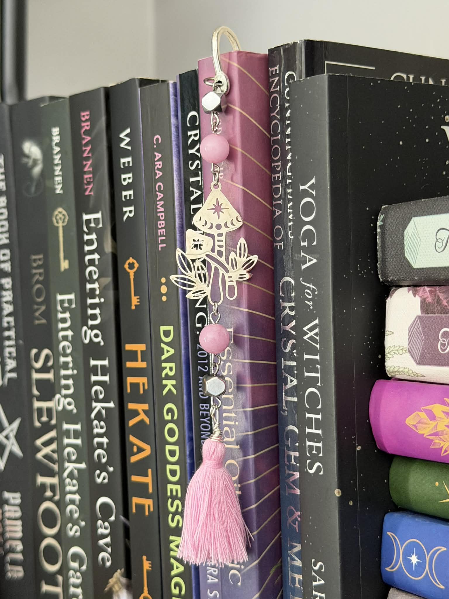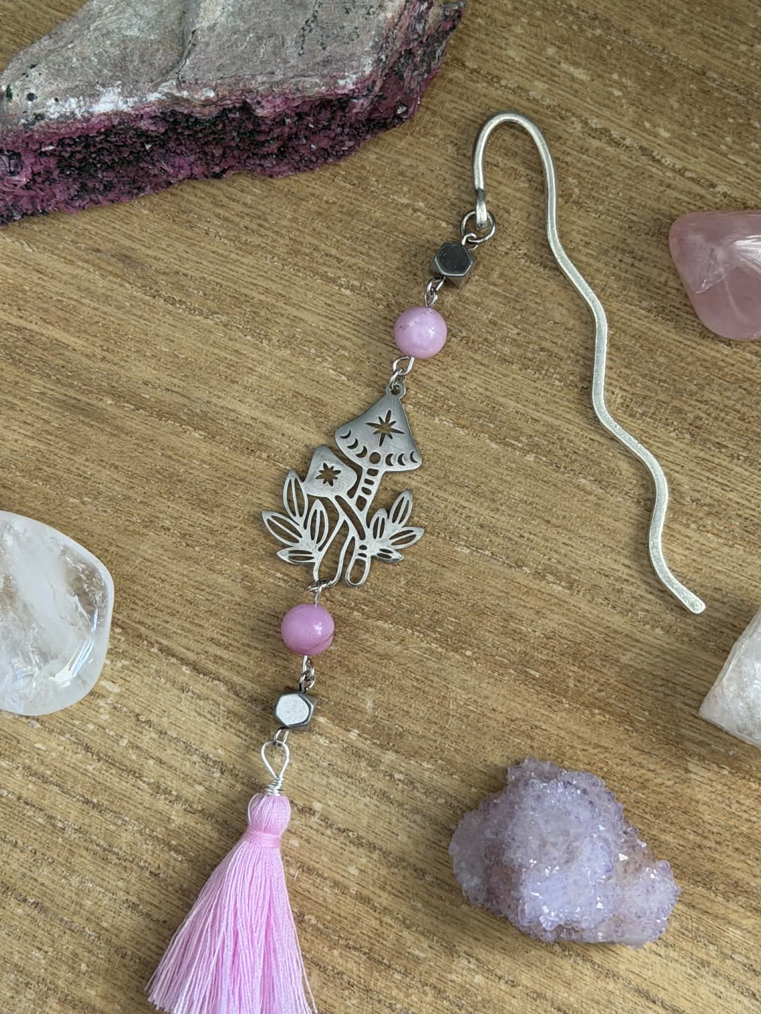 Rose Quartz & Hematite beaded bookmark created with stainless steel paperclip chain, wire wrapped pink tassel, and mushroom charm.