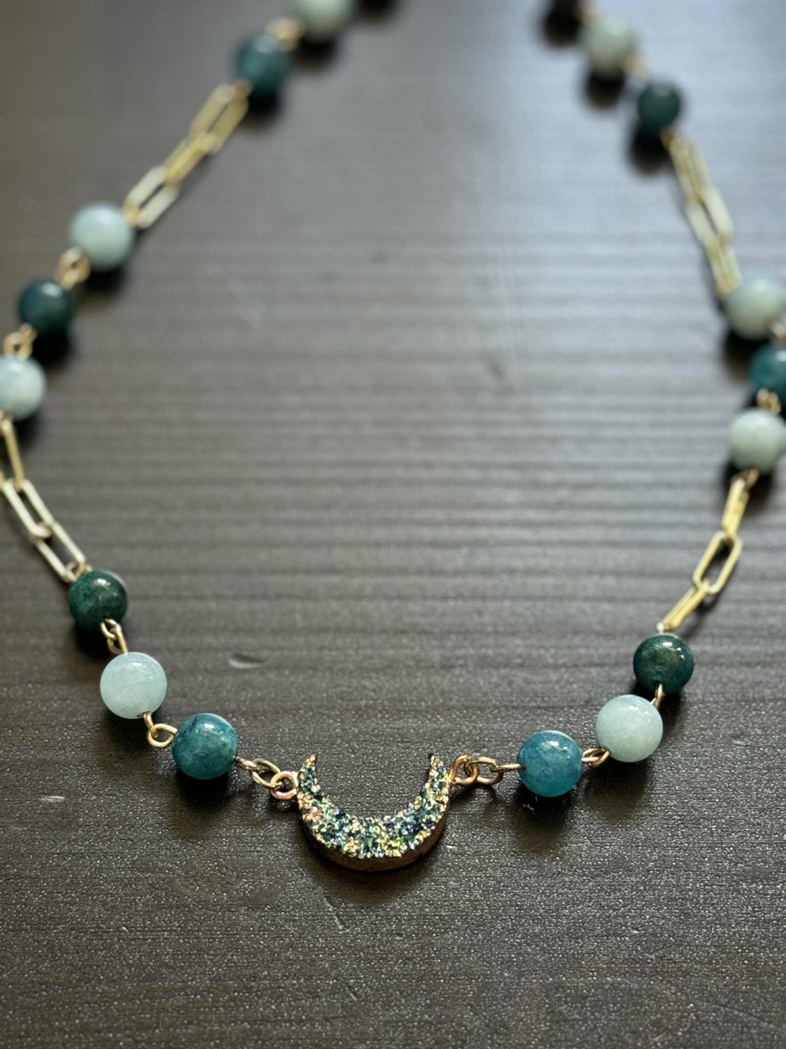 Apatite & Aquamarine beads featured with an electroplated druzy crescent moon pendant