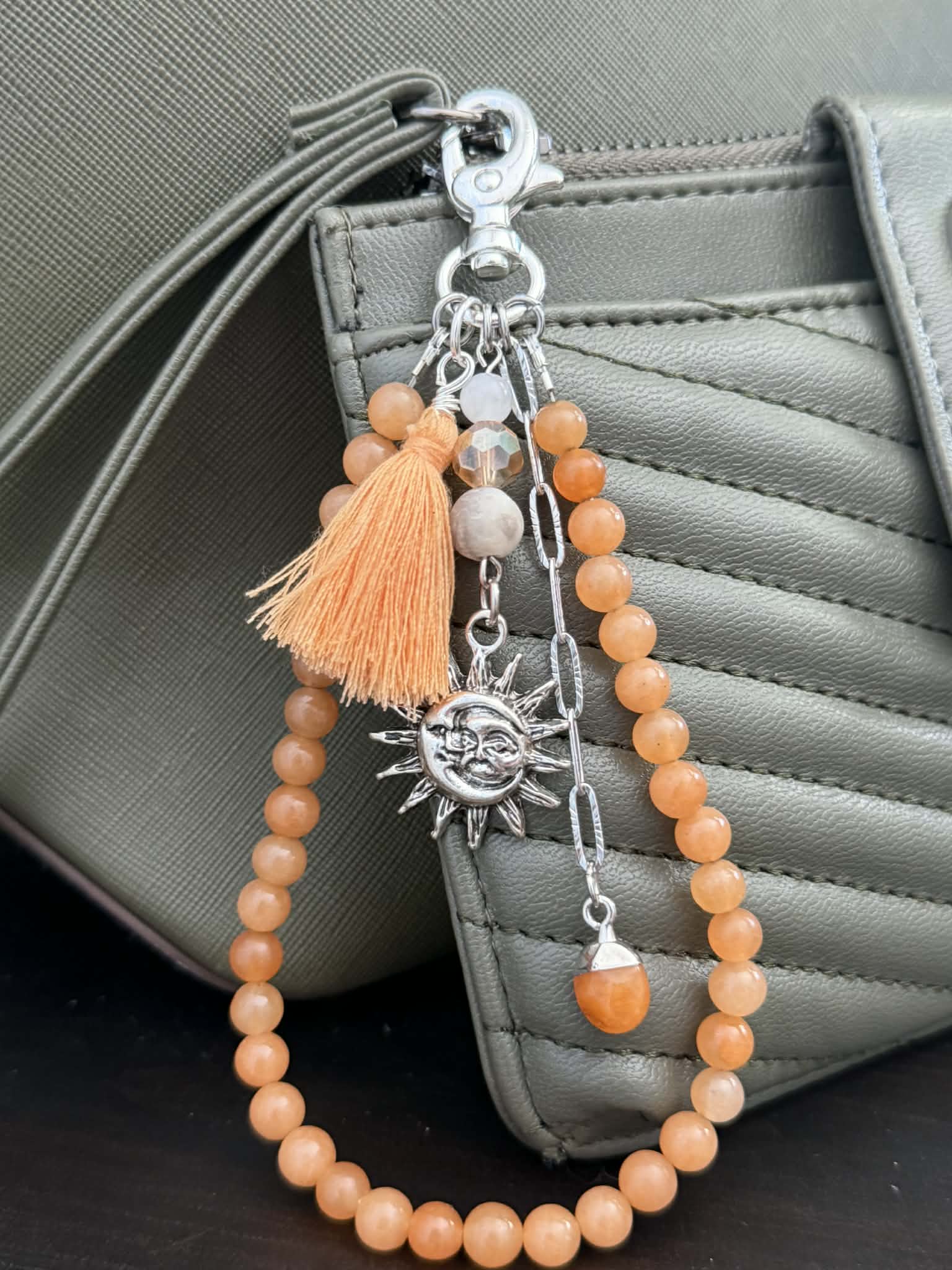 Orange Aventurine beaded handbag charm with stainless steel paperclip chain and a wire wrapped orange tassel.