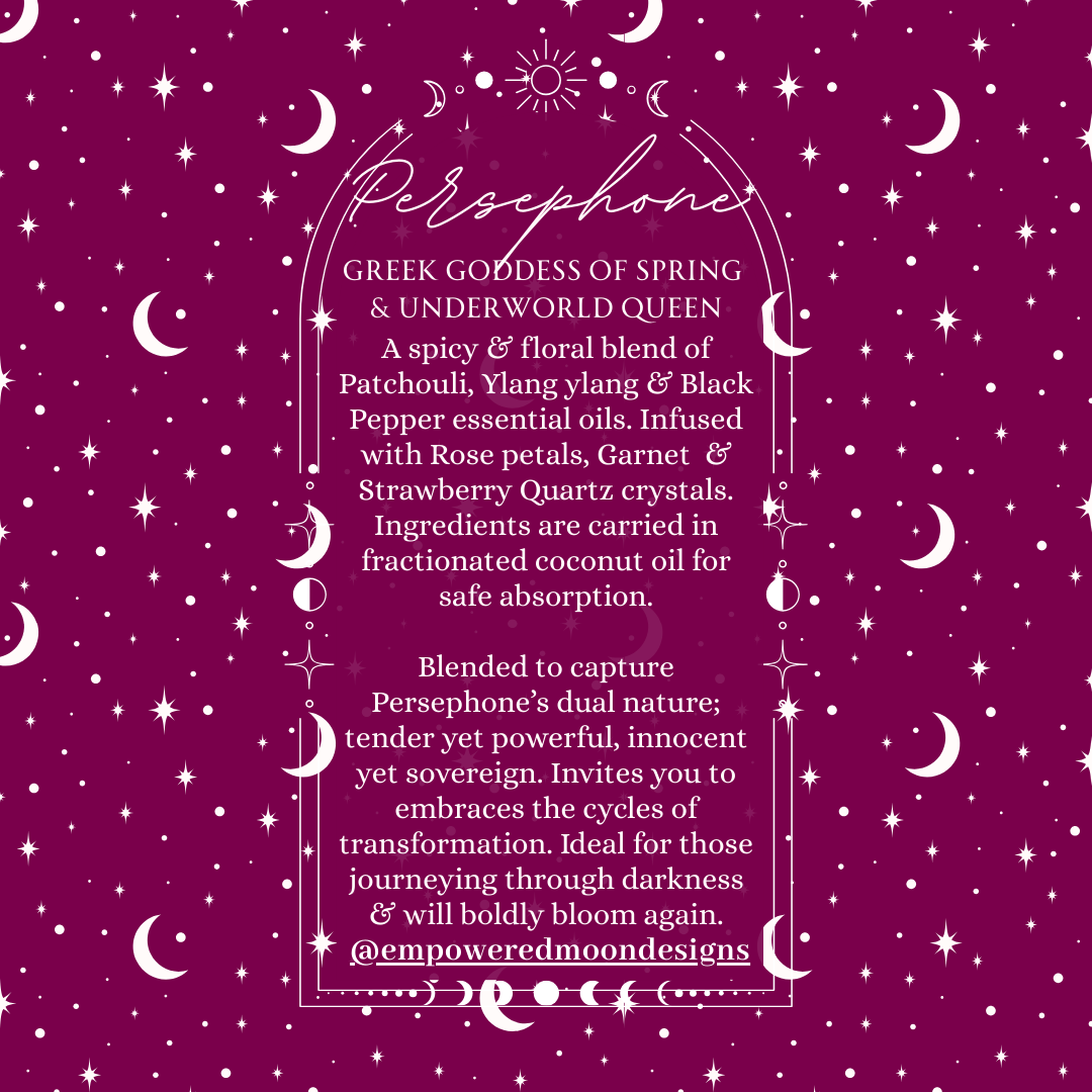 The Queen of the Underworld is associated with shadow, depth, sovereignty. Black Pepper and Patchouli oils are grounding scents that embody earth energy, protection, strength, courage, and banishing negative energy. Dark rose petals are infused for love, life, and regeneration. Garnet crystals, the stone of passion and vital, are symbolically associated with pomegranate seeds and emotional balance and regeneration.