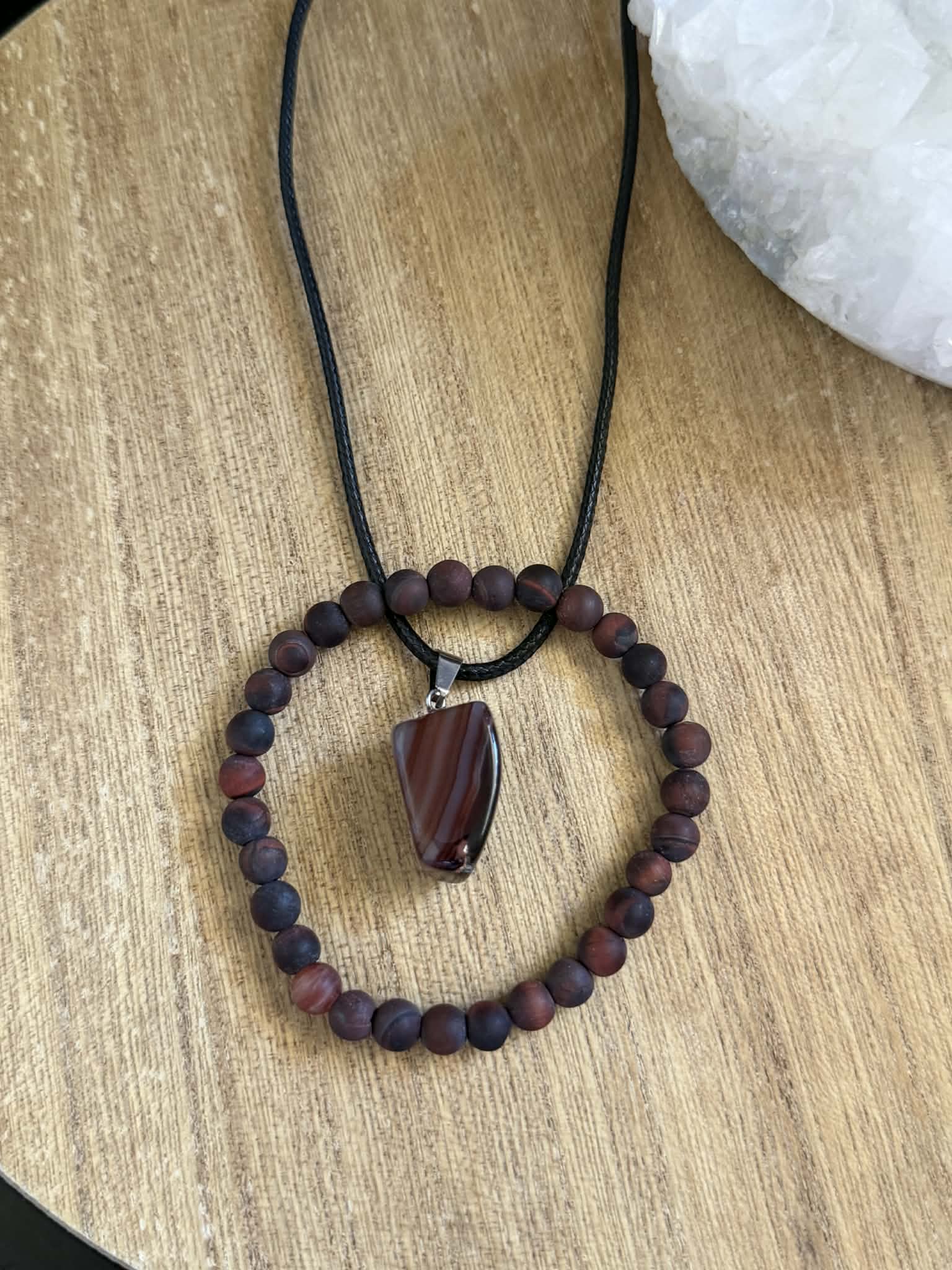 Adjustable leather corded necklace with a red banded agate pendant