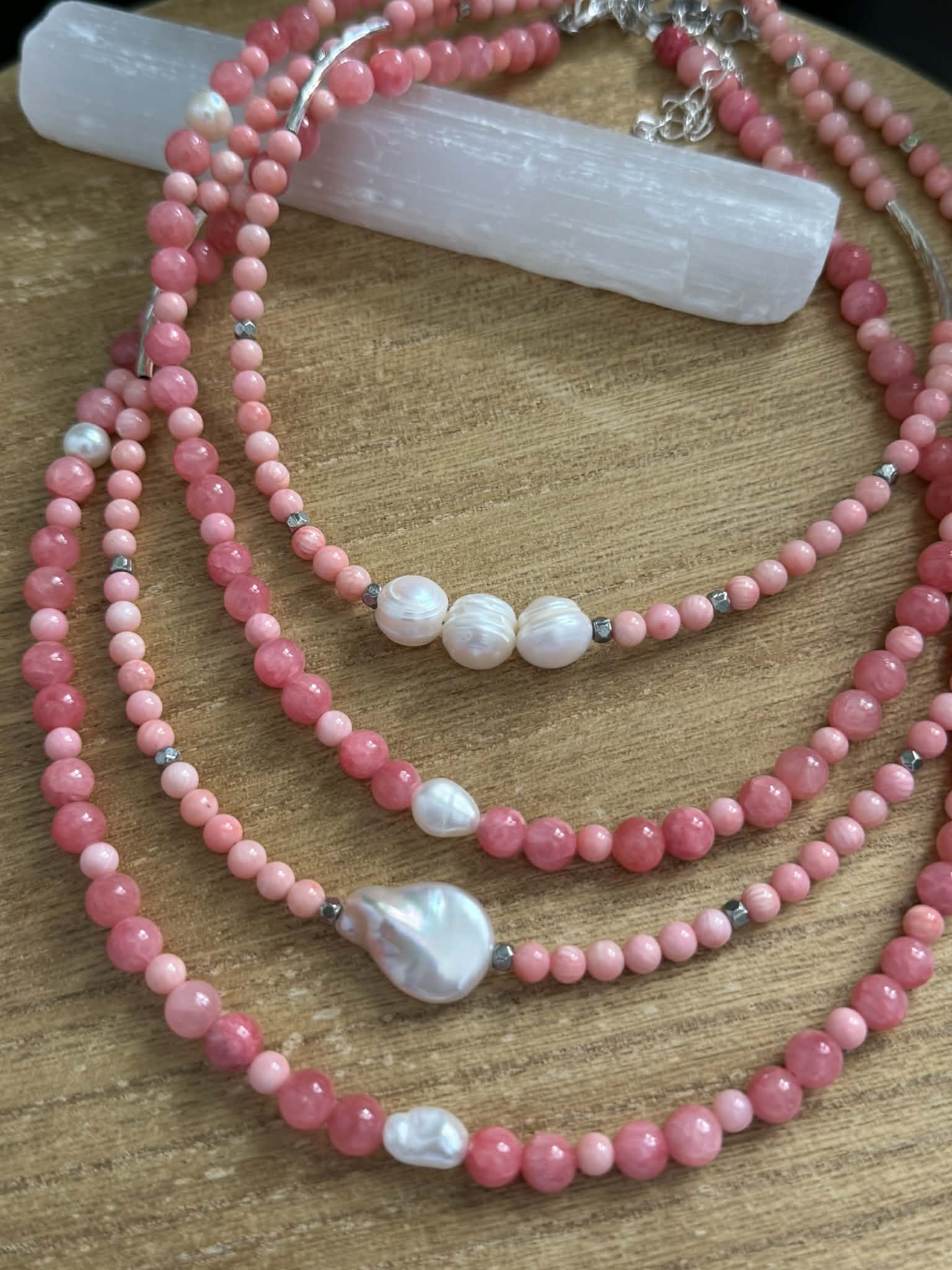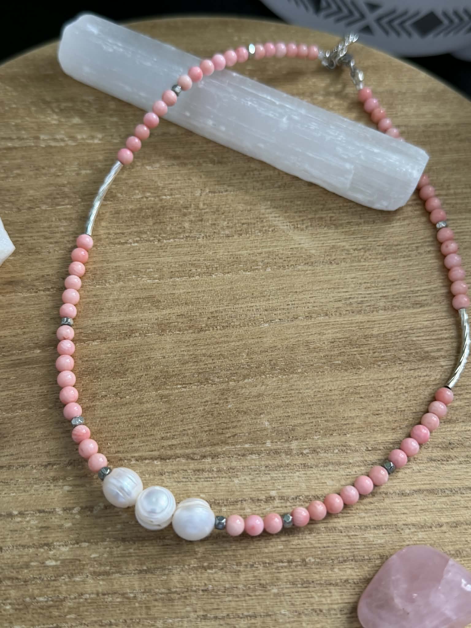 20" minimal style necklace created with 4mm Coral Pink Quartz beads & 3 freshwater pearl beads.