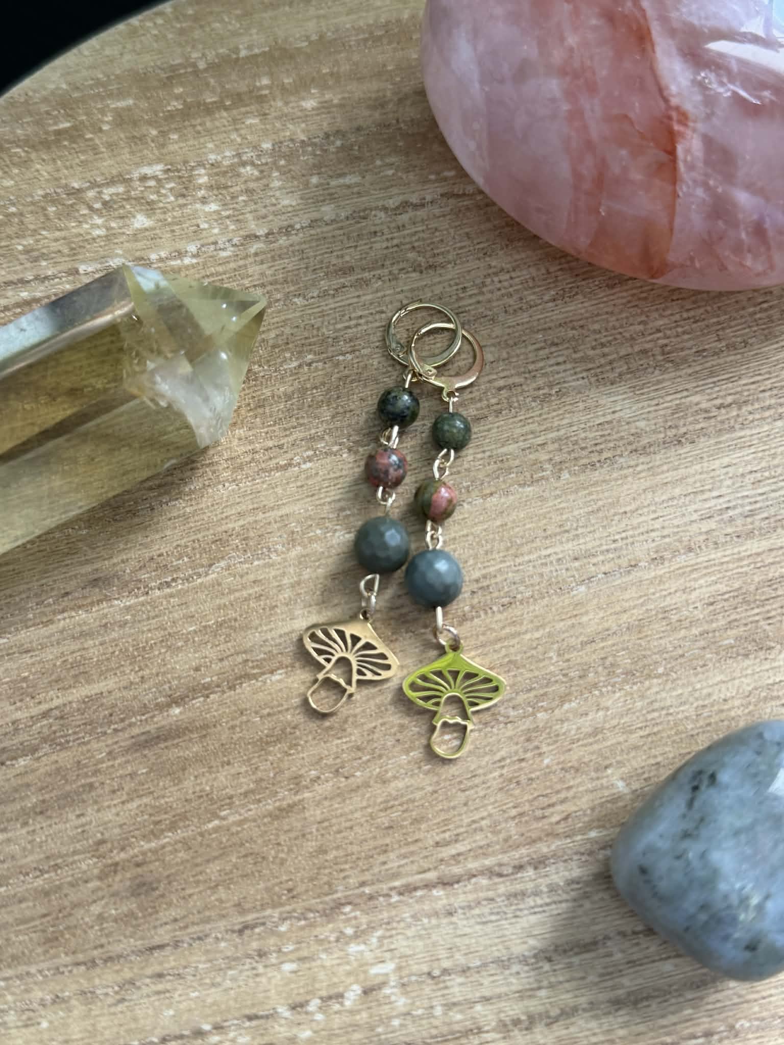 Unakite, Snakeskin Jasper, & Green Jasper beaded earrings. Created with gold plated stainless steel leverback earring clasps & mushroom charms.
